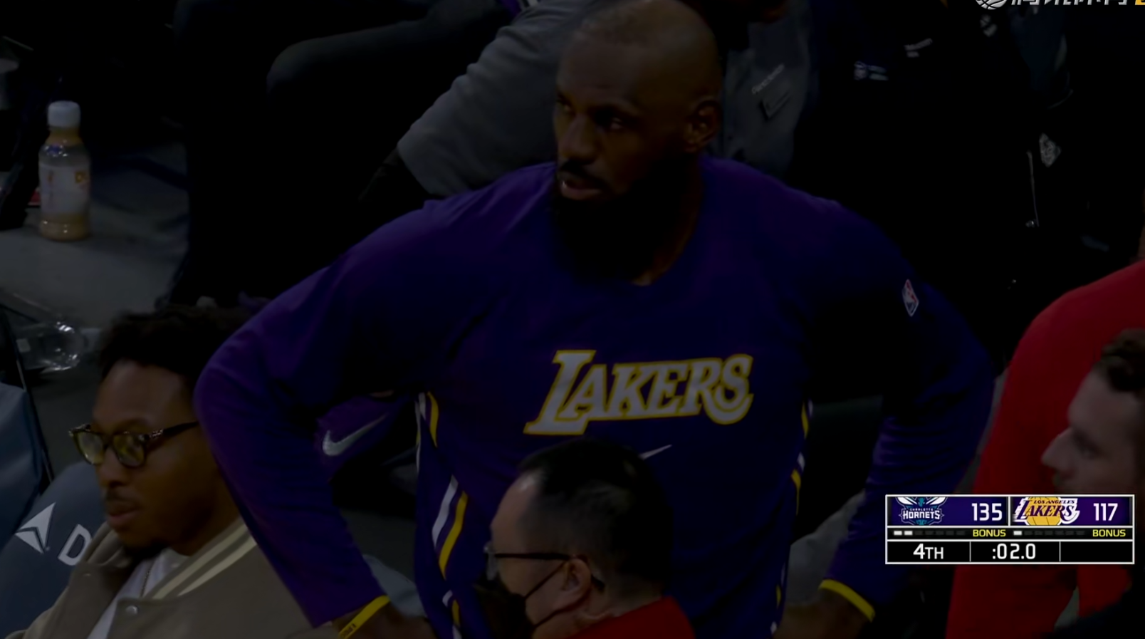 当时湖人被黄蜂打的提前换主力投降,比赛也已经进入到垃圾时间,还剩下两秒的时候,詹姆斯起身看了一眼球场,最后直接返回球员通道了,他当时连衣服都已经穿好了,而此时黄蜂队的球员还在挨个和湖人球员拥抱,甚至连东契奇走之前,都上去和对手击了个掌。而詹姆斯站起来看了队友一眼,二话不说扭头走回球员通道,对于自己队伍的表现是非常不满意的。